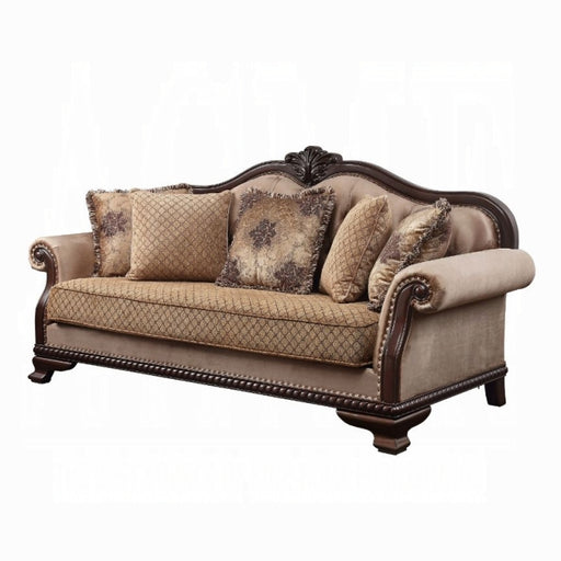 - The Chateau De Ville hutch and buffet offers you plenty of space for all your fine dining accessories from napkin rings to serving platters. The top cabinet is accessed via two tall, arched doors and is outfitted with clear glass panels on the front and sides that allow you to clearly see the contents. Two single-door cabinets are built into the base of the unit, complemented by six pull-out drawers. The frame is built from solid hardwood with molded borders and carved side pillars. A floral medallion crowns the double-arched top.