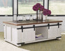 Double take. Sporting a two-tone finish dual-sided lid design and expansive storage space this square coffee table takes the art of rustic farmhouse living to a new level. Designer touches include plank-effect styling heavy distressing and industrial bracket hardware.